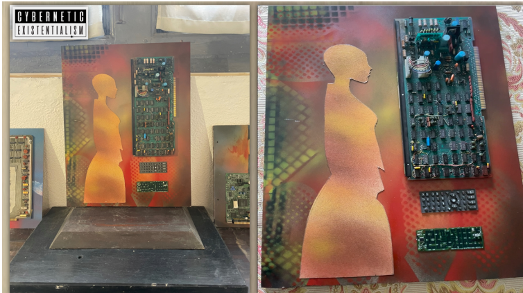 Caselli’s canvas dramatizes this precise tension. On the left, a human form shaped by billions of years of analog evolution. On the right, retired microchips that once executed binary instructions at millions of cycles per second. From the exterior they can be made to converge. From the interior, the gulf may be unbridgeable or simply empty.